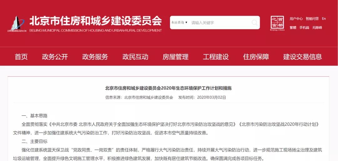 2020年3月2日,北京市住房和城鄉(xiāng)建設(shè)委員會(huì)發(fā)布《2020年生態(tài)環(huán)境保護(hù)工作計(jì)劃和措施》的通知,內(nèi)容強(qiáng)調(diào):