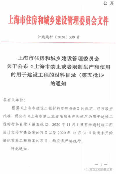 2020年9月30日,上海市住房和城市建設(shè)管理委員會(huì)關(guān)于公布《上海市禁止或者限制生產(chǎn)和使用的用于建設(shè)工程的材料目錄《(第五批)》的通知