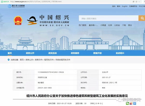 (二)積極推進裝配式建筑發展。保障性住房、政府投資或以政府投資為主的新建公共建筑項目全部實施裝配式建造;紹興市中心城區出讓或劃撥土地上的新建項目全部實施裝配式建造;其他區域新建裝配式民用建筑占新建民用建筑比例達到30%以上,且逐年提高比例;到2025年,全市裝配式建筑占新建建筑比例達到40%以上。